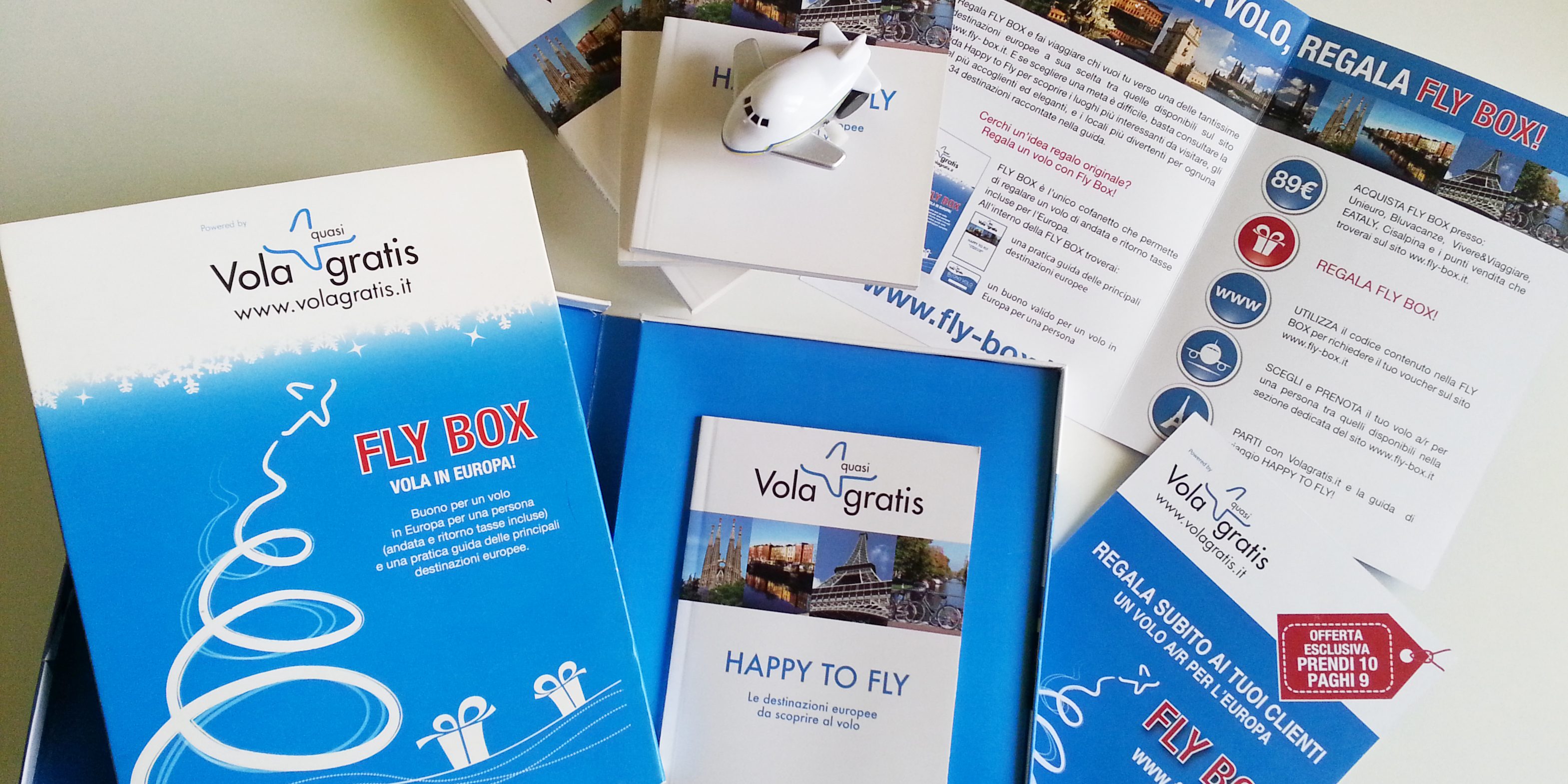 Bravofly, uno dei più grandi operatori in Europa nel mondo dei viaggi, è stato il primo a proporre un cofanetto regalo per voli aerei. Uscito sotto Natale, la scatola riporta i colori del marchio, un blu molto marcato e una grafica stilizzata con un albero di Natale formato dalla scia dall’aereo del logo. La FLY BOX include una guida sulle destinazioni Europee e il voucher con il codice regalo. Successivamente è stata creata una versione che andasse bene per ogni periodo dell’anno e per San Valentino.